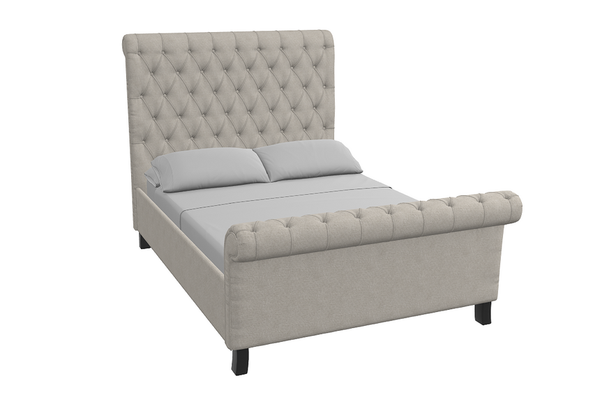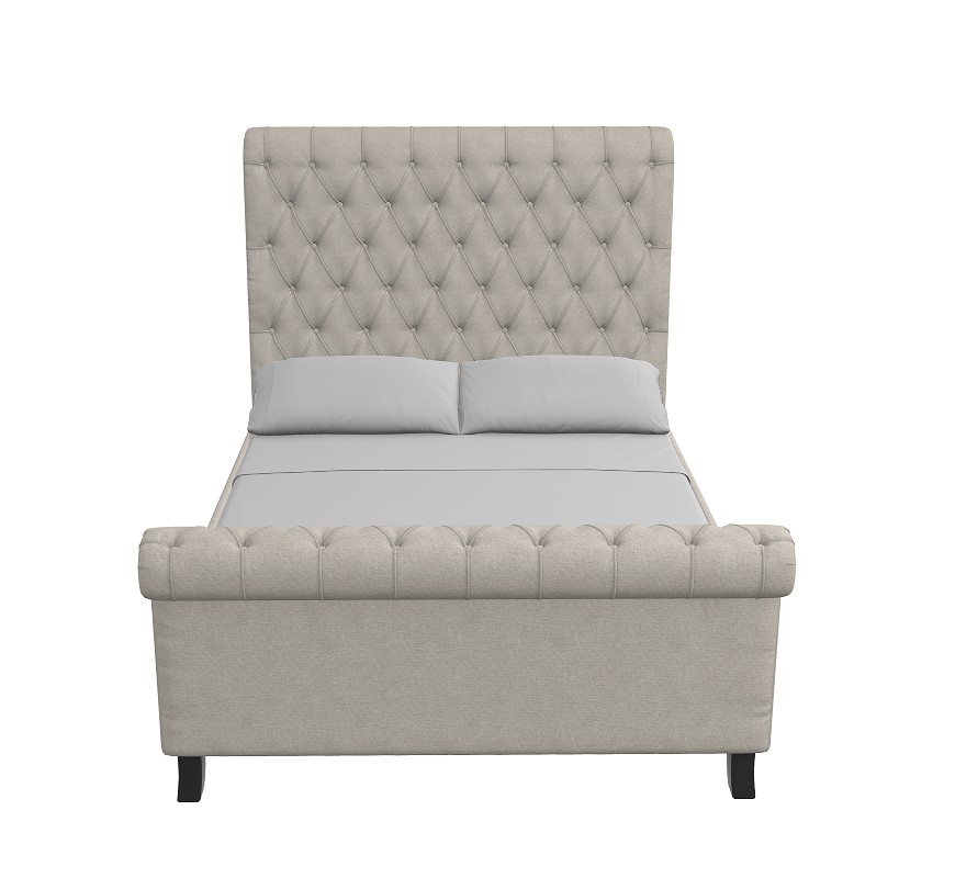 This handsome bed frame is sure to make a statement. It features a scrolled tufted headboard and footboard in a gray upholstery. Spring slats can accommodate a mattress alone, forgoing an additional box spring.