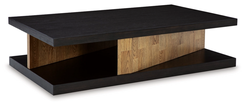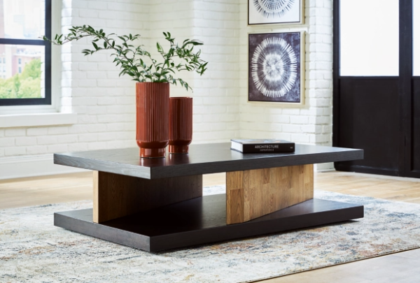 This sculptural coffee table is a perfect blend of contemporary design and relaxed living. Its clean-lined design, contrasting finish and attention-grabbing details take your decor to the next level. The cantilevered top, supported by angled plinths, adds a touch of modern elegance. Need to rearrange for a gathering? No problem....