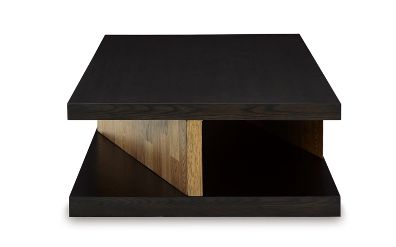 This sculptural coffee table is a perfect blend of contemporary design and relaxed living. Its clean-lined design, contrasting finish and attention-grabbing details take your decor to the next level. The cantilevered top, supported by angled plinths, adds a touch of modern elegance. Need to rearrange for a gathering? No problem. Built-in casters make it a breeze to move this table to any spot for cocktails, morning brew or lively conversation.