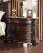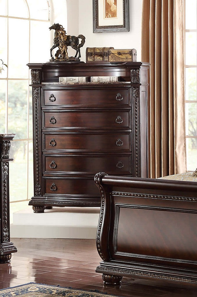 Traditional elegance will be brought to a whole new level with the exquisite Stanley collection. The bedroom pieces carry a warm brown cherry finish and include several distinct features, including ornate wood carvings, marble tops and roped detailing. The faux leather tufted headboard makes it easy to sit up and read a book or watch some television. Plus, the multiple storage options are wonderful for keeping books, magazines, pens, sweaters, jeans, blankets, towels and bed sheets. Add both luxurious style and space to your bedroom decor with the Stanley collection. Price includes: Headboard, Footboard, Rails, Dresser, Mirror, & Nightstand W/ Free Chest.