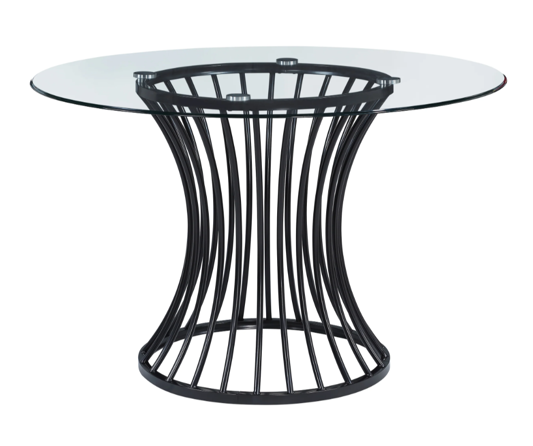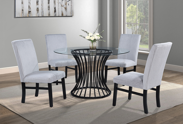 Bring contemporary elegance to your dining area with this stunning dining set, combining sleek design with timeless sophistication. The centerpiece is a striking glass-top table, featuring a sculptural black metal base that adds an artistic flair and a sense of openness to your space. The chairs, upholstered in a soft, dove-gray fabric, offer exceptional comfort and a modern aesthetic, while their sturdy black frames ensure durability. Perfect for intimate dinners or entertaining guests, this set seamlessly blends style and functionality, making it an ideal addition to any modern home.
