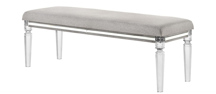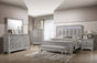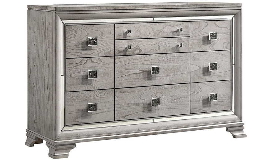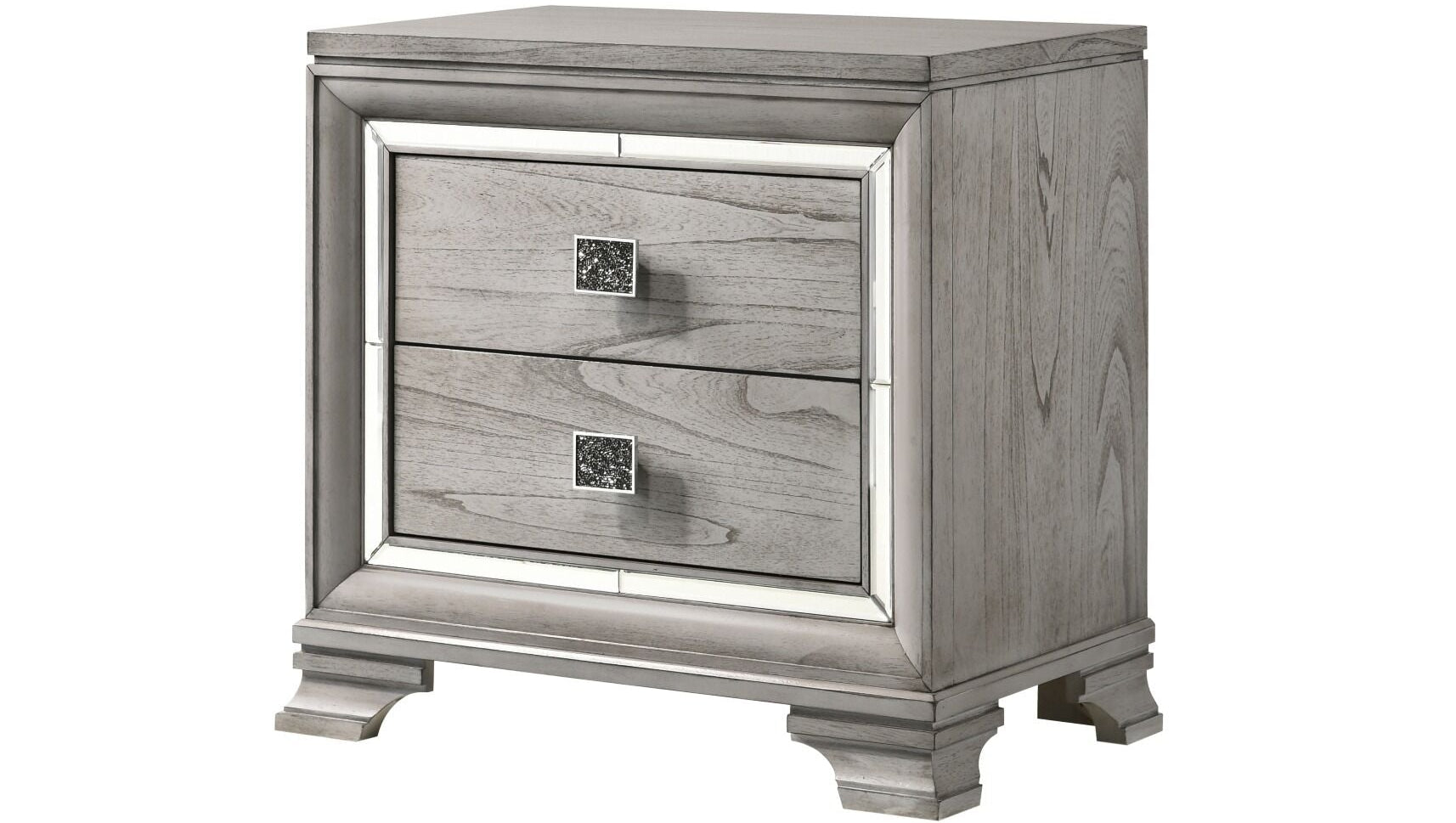 Give your bedroom a glamorous upgrade with the Vail Collection bedroom set. This bed comes with an LED light up headboard, upholstered vertical tufted insert, and mirror accent borders. The three drawer nightstand provides glitzy, spacious storage. The dresser boasts lined jewelry drawers and all the storage pieces have crystallized square knobs. The dresser top has the coordinating beveled mirror border as the rest of the collection. The grey wood pattern finish brings this collection together and adds to its stand out elegance.