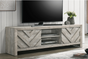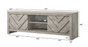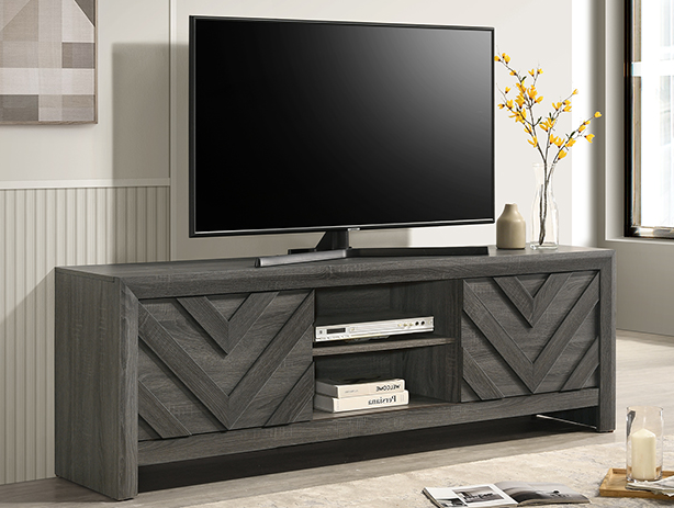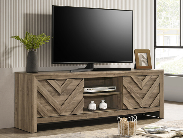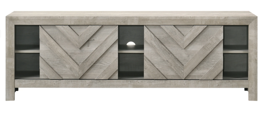 Discover the epitome of rustic elegance with this captivating entertainment console, designed to anchor your living space with its distinct and artful presence. The washed wood finish offers a serene, natural aesthetic that brings the essence of a tranquil retreat into your home. The geometric chevron patterning on the cabinet doors adds a touch of modern sophistication, making it a versatile piece that complements both contemporary and traditional interiors. Function meets form as this console provides ample space for multimedia devices, gaming consoles, and other essentials, all while maintaining a clutter-free environment.