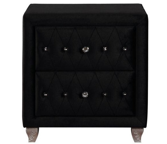 Glamorous and streamlined, this two-drawer black nightstand is full of fun details. Great for a chic bedroom, the sleek silhouette is covered in velvet fabric for a luxurious feel. Curved metallic legs add an extra layer of sophistication.