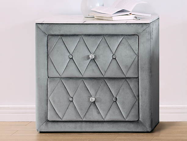 This elegant nightstand brings a touch of luxury to any bedroom with its rich, velvety texture and diamond-patterned tufting. The soft, plush exterior is complemented by gleaming crystal-like drawer knobs, adding a hint of glamour. With two spacious drawers, it offers ample storage for bedside essentials while maintaining a sleek and sophisticated look. The contrasting marble-style top provides the perfect surface for a lamp, book, or decor item, seamlessly blending style and function. Ideal for those seeking a statement piece, this nightstand elevates any bedroom with modern opulence.