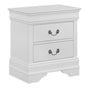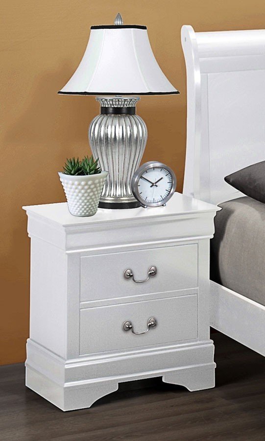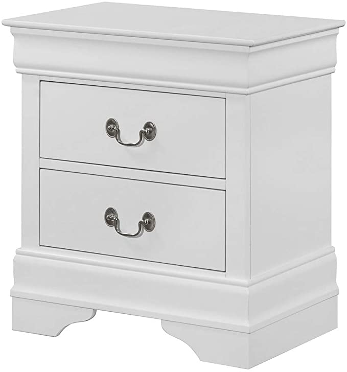 The Philip White Nightstand is an enchanting addition to your sleeping space. Made with select hardwoods and a white finish, this piece is warm and matches well with any décor. This piece has beautiful features such as simple molding at the top, metal bail handles and bracket feet