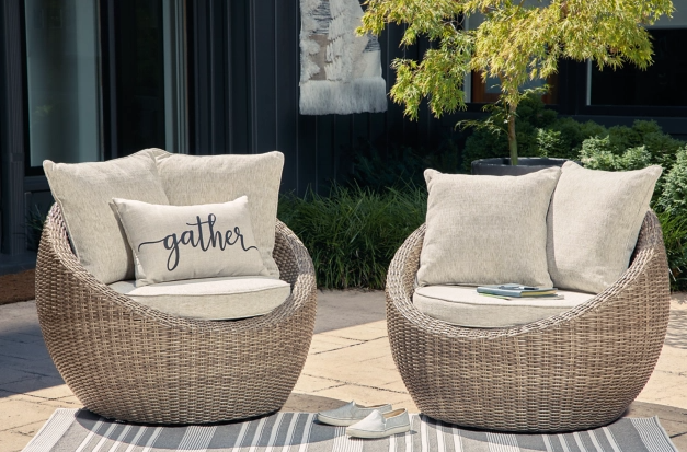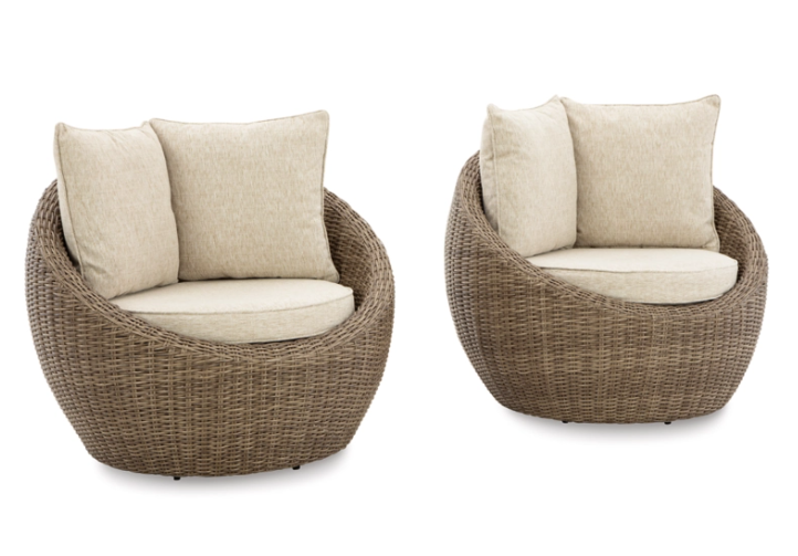 This swivel lounge chair completes your outdoor seating area with its fresh take on casual comfort. Handwoven resin wicker over a curving aluminum frame balances streamlined style and exceptional durability. High-performance beige Nuvella+™ fabric wraps the seat and back cushions, protecting against the natural elements. Set of 2 All-weather resin...