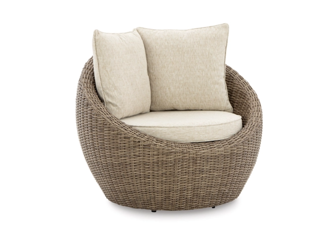 This swivel lounge chair completes your outdoor seating area with its fresh take on casual comfort. Handwoven resin wicker over a curving aluminum frame balances streamlined style and exceptional durability. High-performance beige Nuvella+™ fabric wraps the seat and back cushions, protecting against the natural elements.