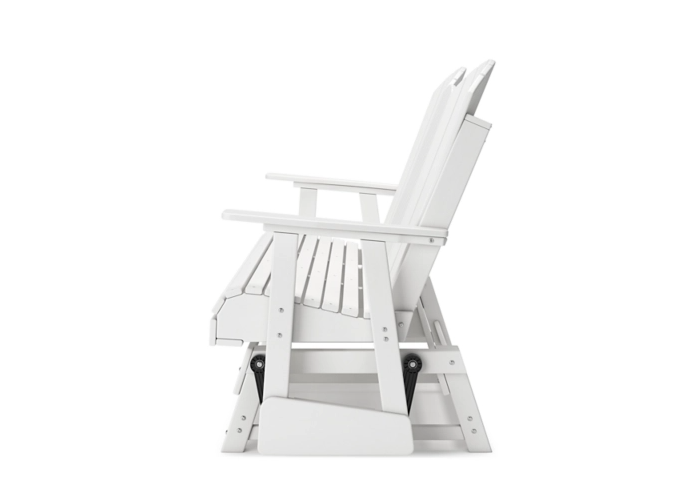 Drift away from everyday worries and into outdoor bliss with this glider loveseat. Dressed in a crisp white, the Adirondack-inspired design has a classic feel. It weathers sunny summer days and cozy winter nights with durable MEGA-TUFF® HDPE material. A drop-down console with integrated cup holders keeps refreshments and snacks within easy reach. With the console snapped into the back, this loveseat has even more room for enjoying lazy days in the shade.