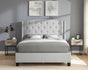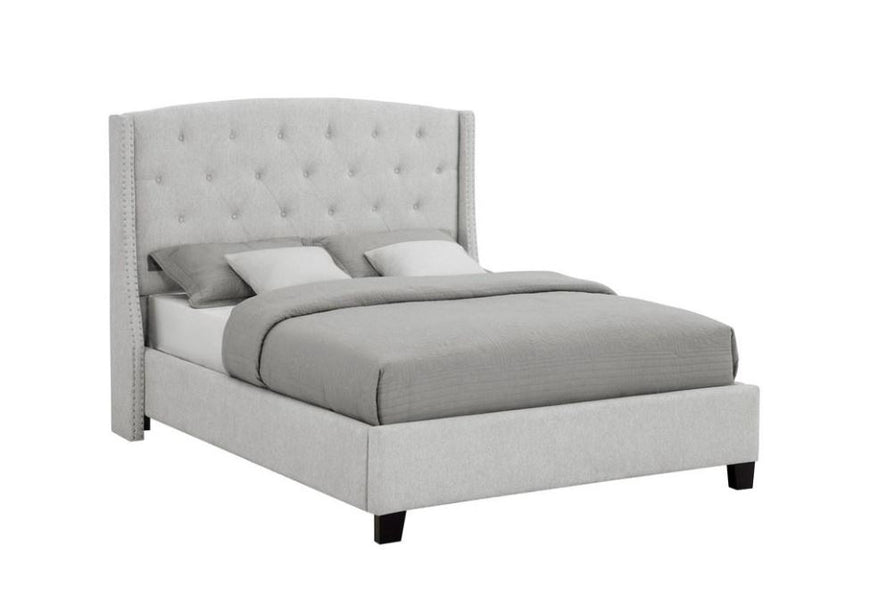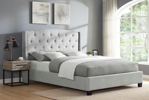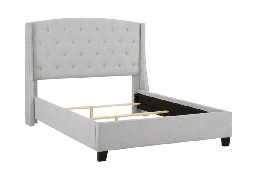 Weatherly upholstered queen bed comes in a dove grey, grey and black finish and features a button tufted headboard, two wings with accent nail head trim, and sturdy wooden legs. This piece will surely add style to any bedroom. BOX SPRING NEEDED WITH THIS BED