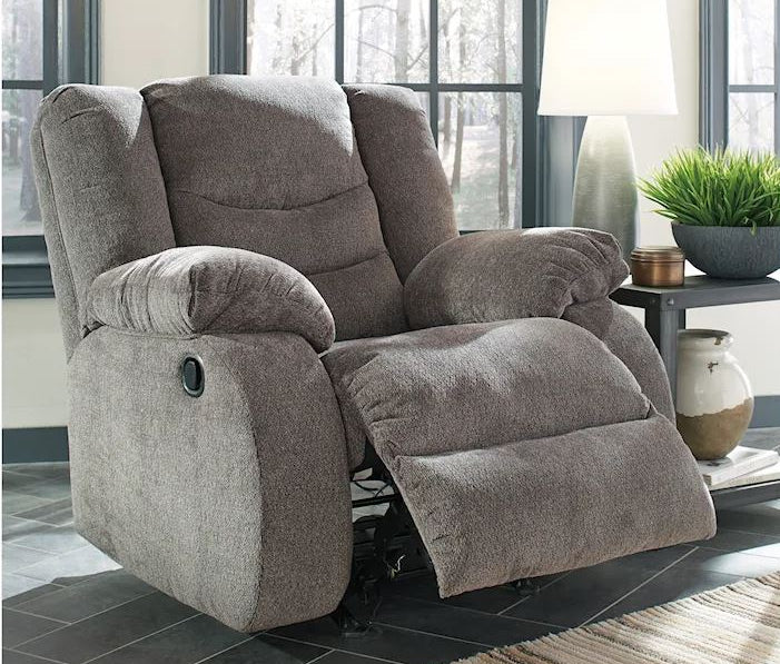 This rocker recliner is designed for ultimate comfort and relaxation. Featuring a waterfall back design and extra-plump pillow top arms, it combines style with coziness. The soft chenille fabric adds a luxurious feel, while the ample seating space ensures you can stretch out and unwind. Whether you're watching a game or reading a book, this recliner offers endless comfort possibilities. Sit back, relax, and enjoy a winning experience with this rocker recliner.