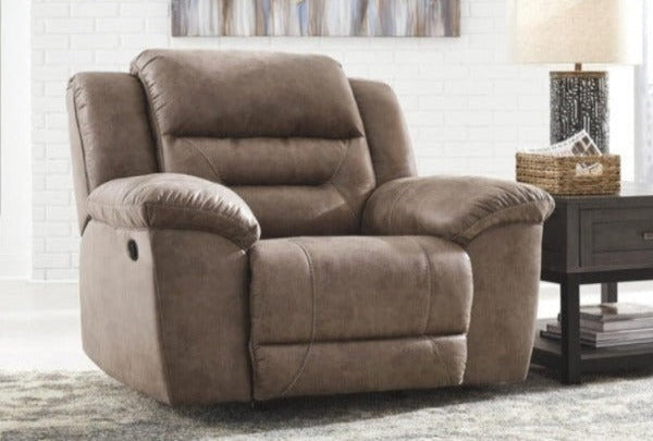 For those that love the cool look of leather but long for the warm feel of fabric, this rocker recliner delivers both with ease. Its high-performance padded faux leather is remarkably durable and easy to clean, just the thing for family spaces. Channel-stitched back cushions provide indulgent lumbar support for maximum comfort—not to mention fashion-forward flair.