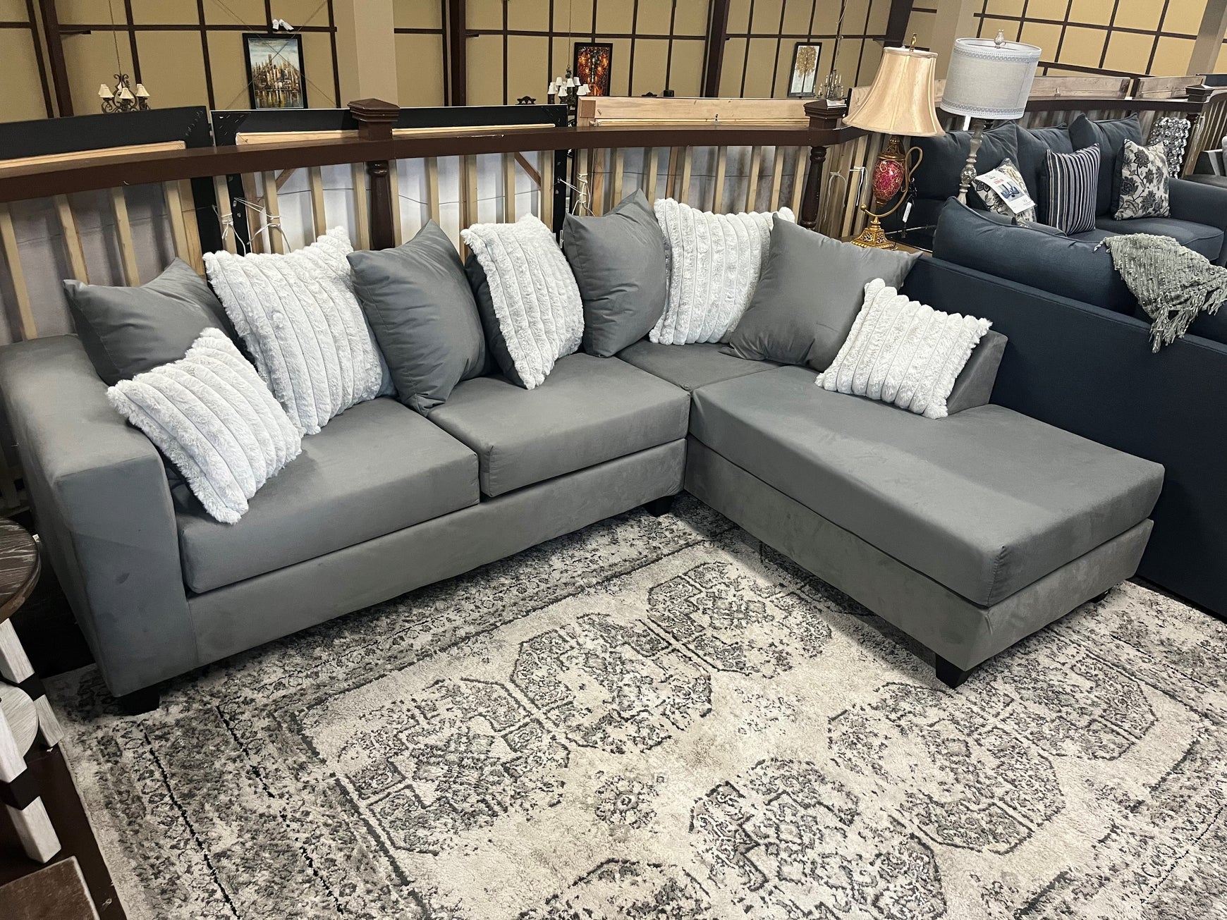 Sleek, contemporary style is epitomized with this sectional. It offers a great look to your living room with loose back cushions with button-tufting, reversible seat cushions, and track arms. Two sets square accent pillows and tapered feet in a dark finish contribute to the stunning style and comfort of this sofa.