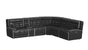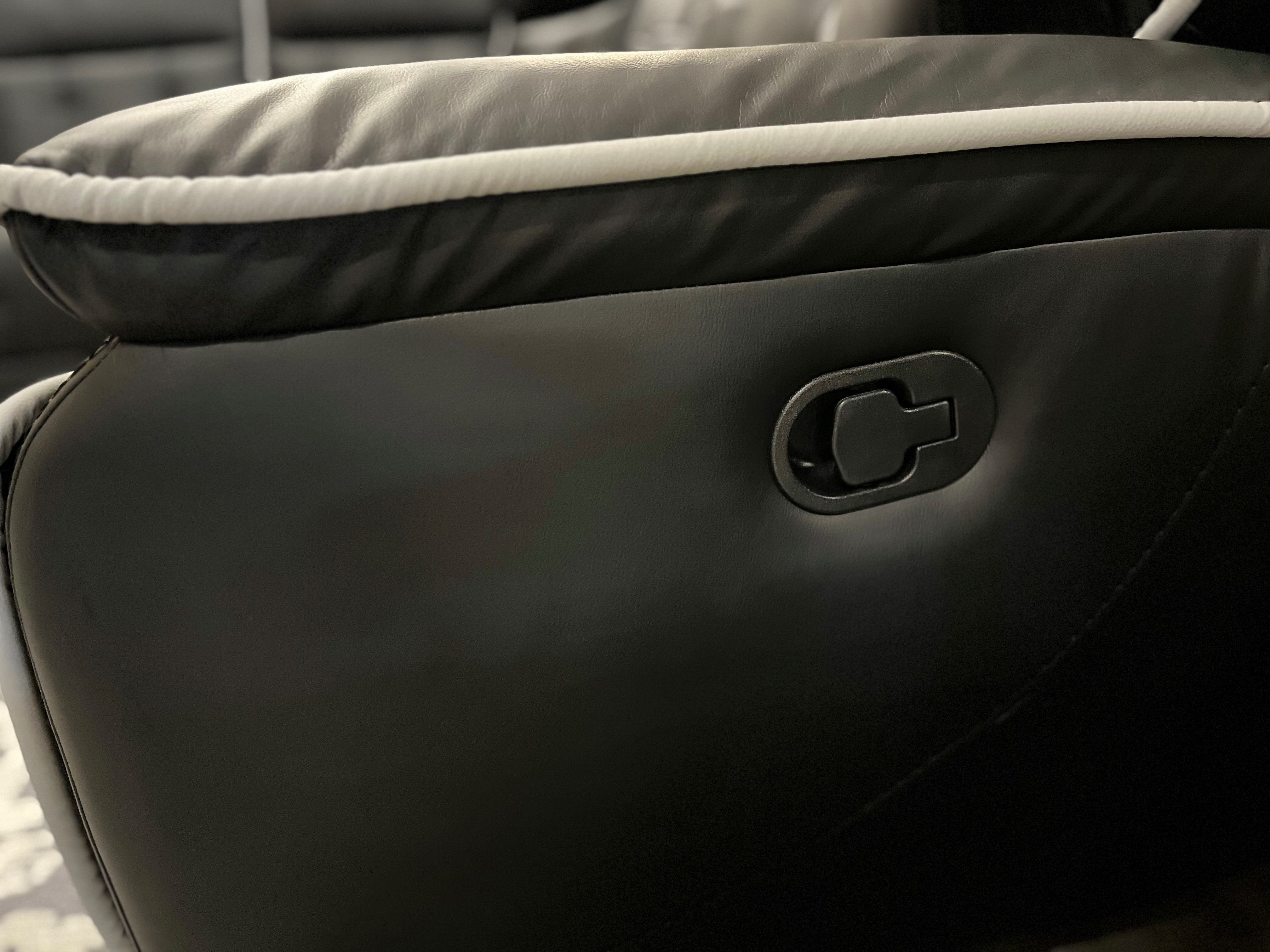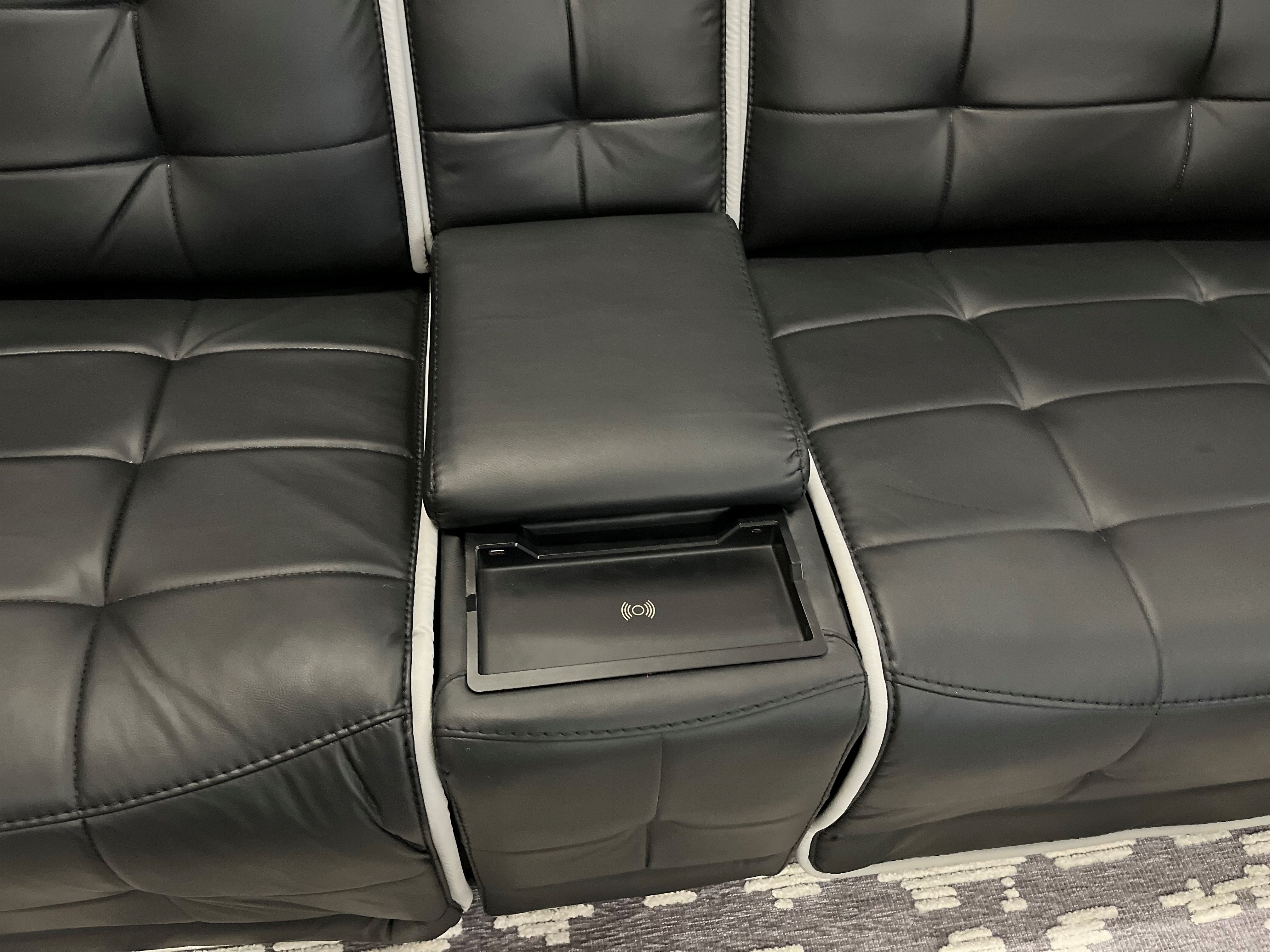 The Home Run sectional features a sleek combination of black and grey upholstery. The fabric is likely a durable, soft-to-the-touch material like microfiber or a high-quality polyester blend, offering comfort and easy maintenance. Integrated into the console between the seats is a wireless charging port offering convenience and eliminating the need for extra cords or outlets. This type of sectional is perfect for anyone looking to combine style, comfort, and the latest technology in their living space.