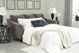 Set the scene for a modern space full of casual flair with this queen sofa sleeper. it's textured chenille with solid microfiber upholstery provides a luxuriously soft feel that’s inviting. Gently flared arms and plush seat cushions welcome comfort and relaxation. The on-trend slate-colored upholstery offers a perfect background for the four decorative pillows to pop with beauty. Pull-out queen mattress comfortably accommodates overnight guests.