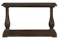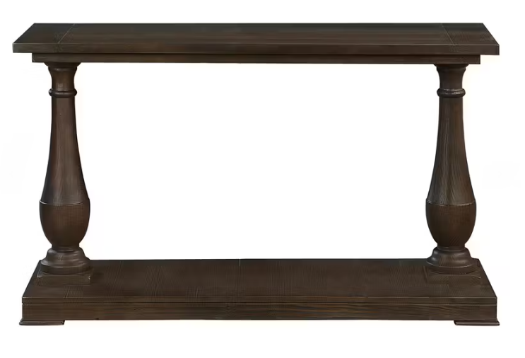 Perfect for a living room or entryway foyer, this transitional sofa table lends a charming traditional flair. A rich coffee brown finish offers a refined look to the tropical wood construction, creating a bold look against a focal wall. This sofa table also offers a spacious and long tabletop and open bottom shelf for resting accent lamps, baskets of throws and more. Connecting the plank style surfaces are column-like turned pedestal legs that offer a classical element. A tall and open space above the bottom shelf invites one to store taller decorative items too.
