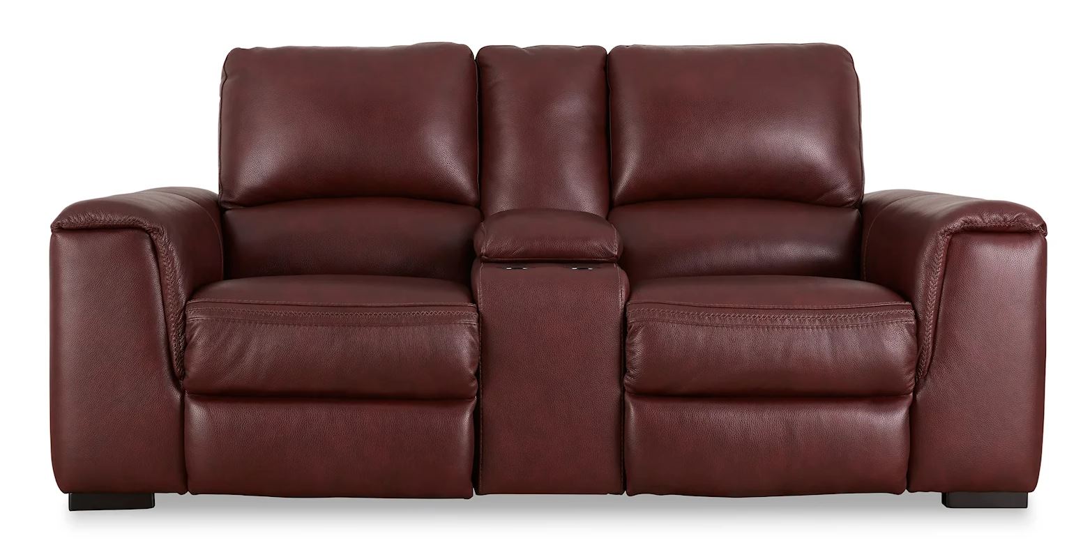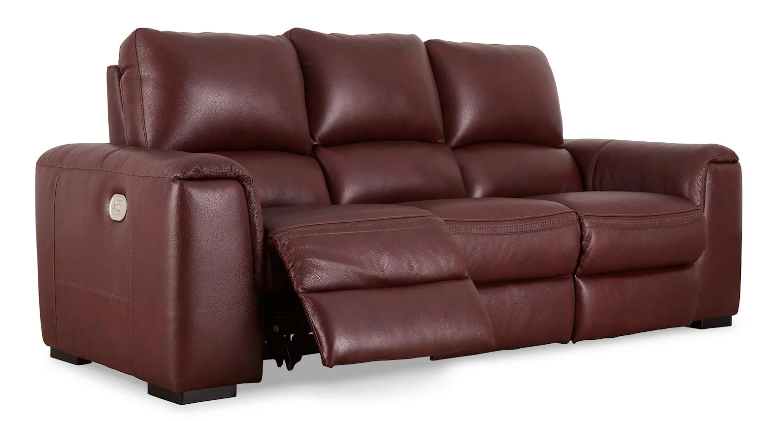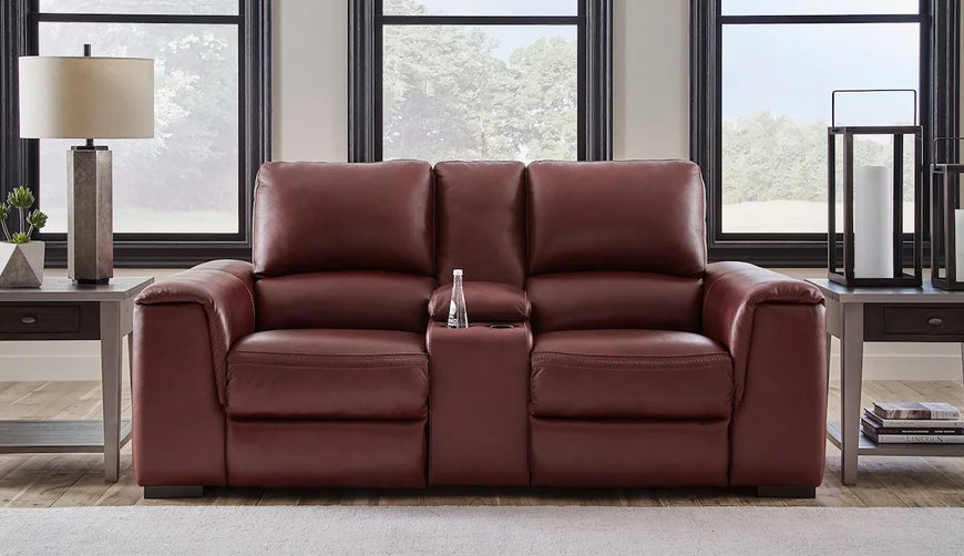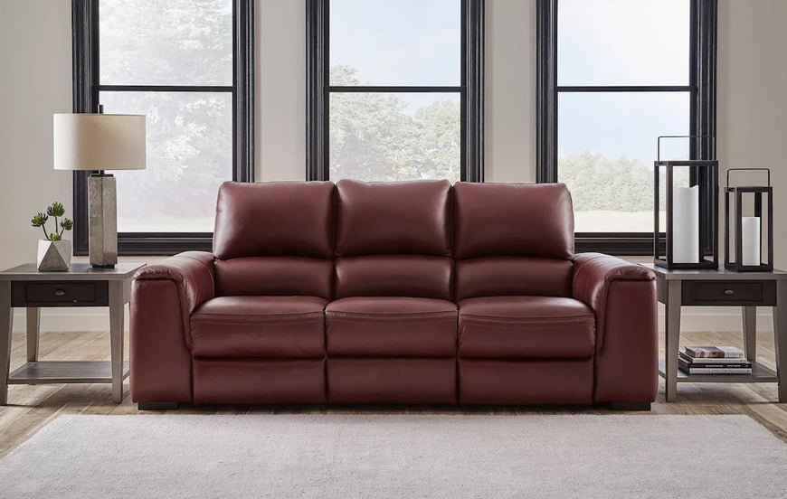 Impressive in scale while keeping an air of refinement, this power reclining group stuns with soft, supple leather match upholstery in garnet. Sink into real leather in the seating area and inside back while catering to your comfort with one-touch power reclining and an adjustable headrest. Complete with USB charging, this group makes a surefire statement in your contemporary living room