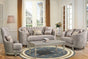 Add a glamorous flair to your contemporary home with this three-piece living room set, which includes a sofa, loveseat, and armchair with gently curved silhouettes and arms that invite you to sit with a cocktail. Wrapped in a soft velvet upholstery, each piece's interior is button tufted with individually placed nail heads. Lining the graceful, track-like style arms, and bottom edge of each seat, is a nail head trim for a classic touch. Each furniture piece rests on turned wood legs in a contrasting silver finish. Included with both the sofa and loveseat are accent pillows in a striking silver and gold finish.