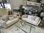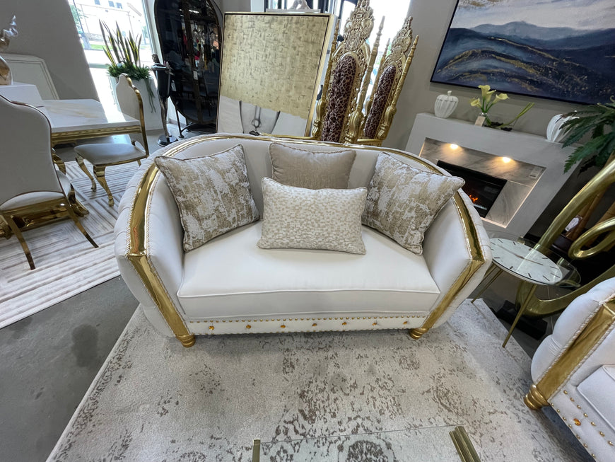 Transform your living space into a regal retreat where timeless elegance meets modern comfort. This luxurious three-piece set includes a statement sofa, a cozy loveseat, and a high-back accent chair—each meticulously crafted to blend classical charm with contemporary sophistication. This set exudes refined glamour by featuring gracefully curved silhouettes, tufted detailing, and sculpted gold accents.