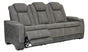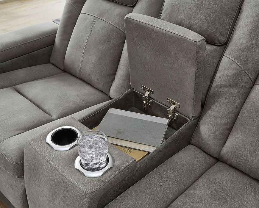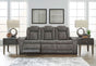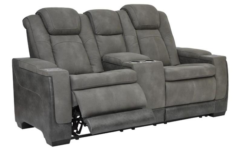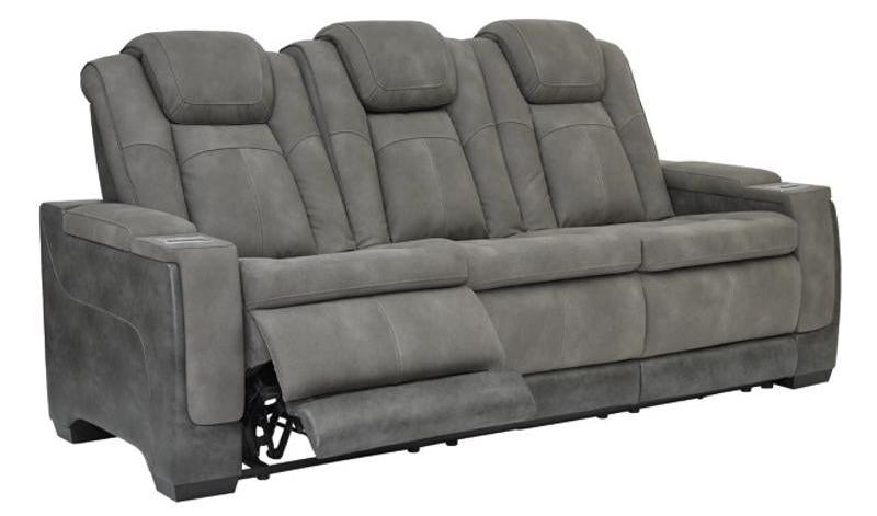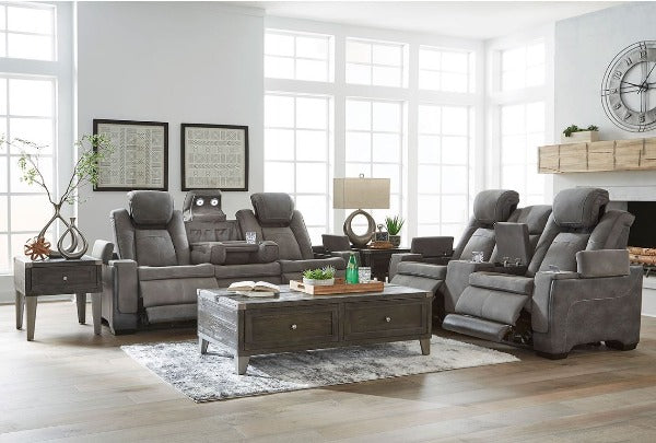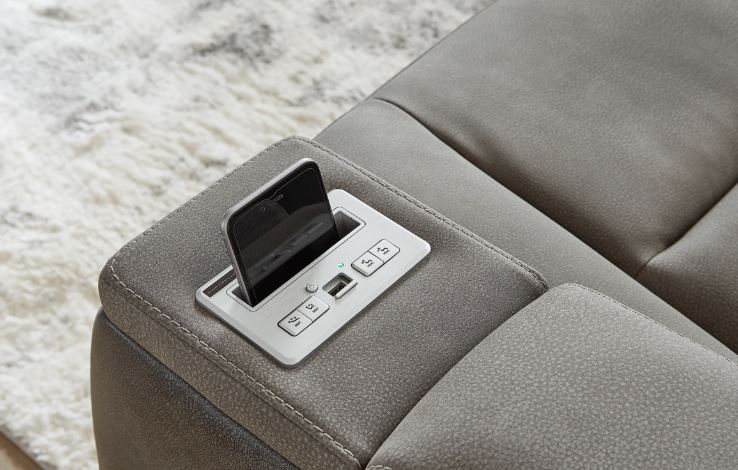 This sleek, ultra-modern Tyson Power Reclining Living Room Set has it all. With designer looks and head-to-toe comfort, the reclining sofa with a drop-down table has the upscale look of leather at a scaled-down faux leather price. Its two-tone Durapella upholstery is more durable and water-repellent than regular leather, an added bonus for families with children or pets. Features including wireless and USB charging, an adjustable headrest, and an extended "zero-gravity" ottoman for improved circulation make this the next generation of power recliners.