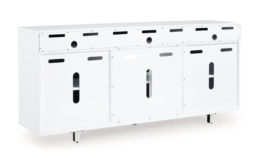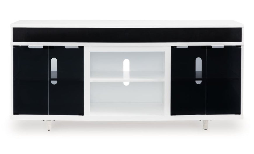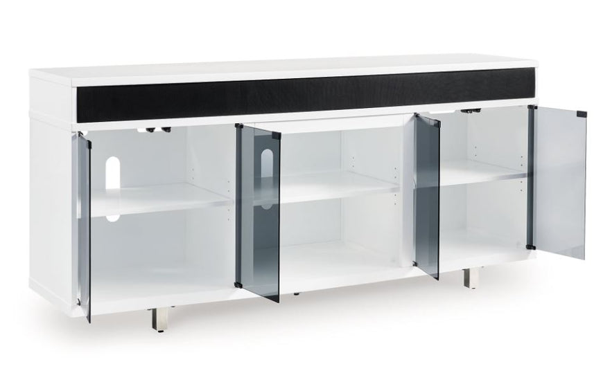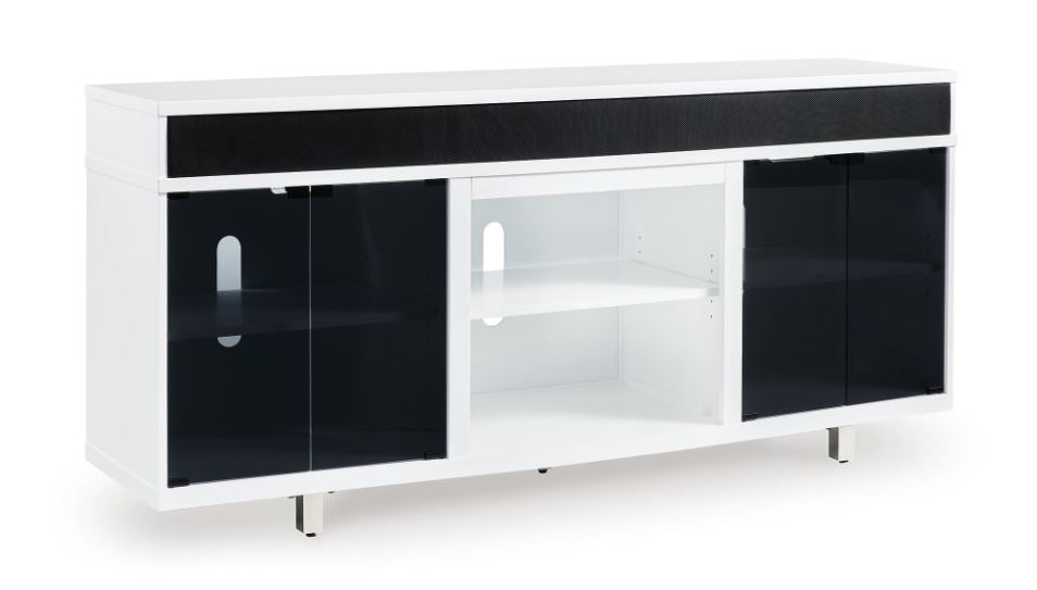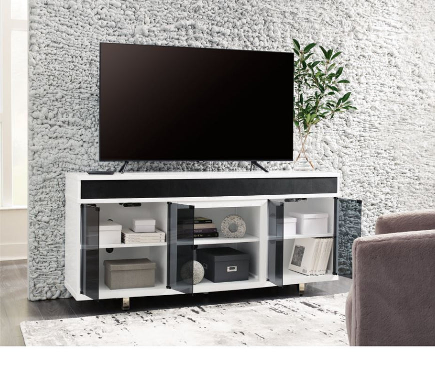 Combining a white high-gloss finish with black glass doors, this TV stand proves opposites really do attract. It's the perfect blend of modern style and functionality, with an electric fireplace option and ample space for your media devices, flat-screen TV and soundbar. What a smart choice on so many levels....