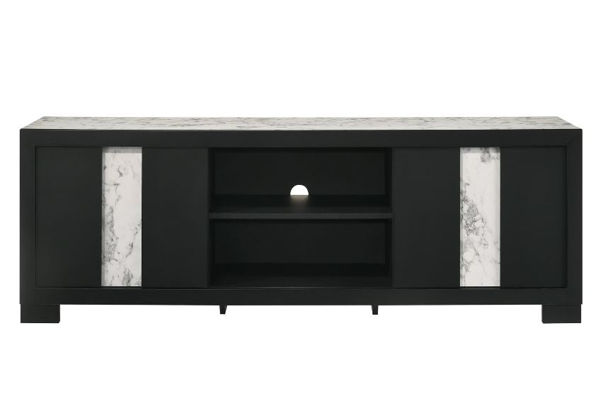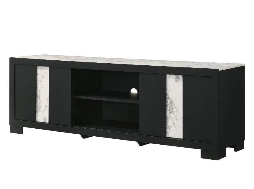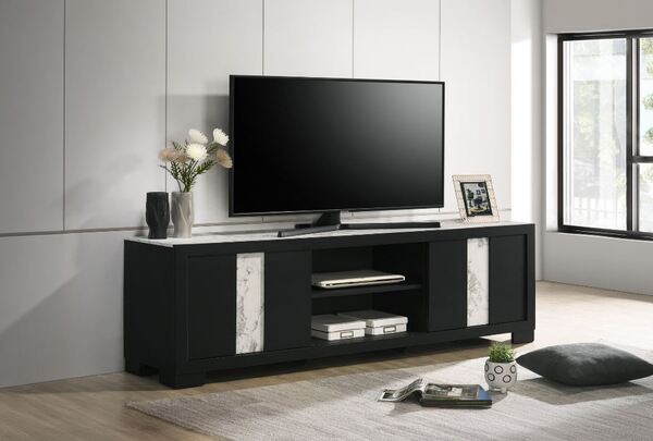 This sleek and modern entertainment unit is the epitome of contemporary elegance and functional design. Boasting a bold finish with striking marble-like accents, this piece serves as a captivating centerpiece for any living space. Its generous surface perfectly accommodates large screen displays, while the ample storage space including open shelving and discreet cabinets provides a neat solution for all your multimedia devices.