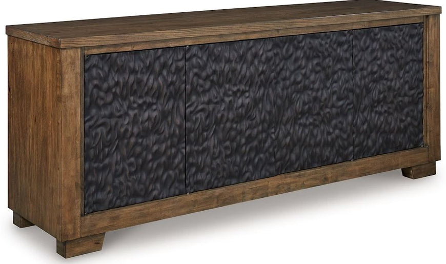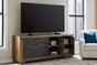 This TV stand is not just furniture—it’s a work of art. The cabinet door design is nothing short of a masterpiece. Its deep tribal texture and two-tone finish convey an intentional hand-carved feel creating a unique and attractive surface. Boasting an abundance of storage space and cord management, the large-scale...