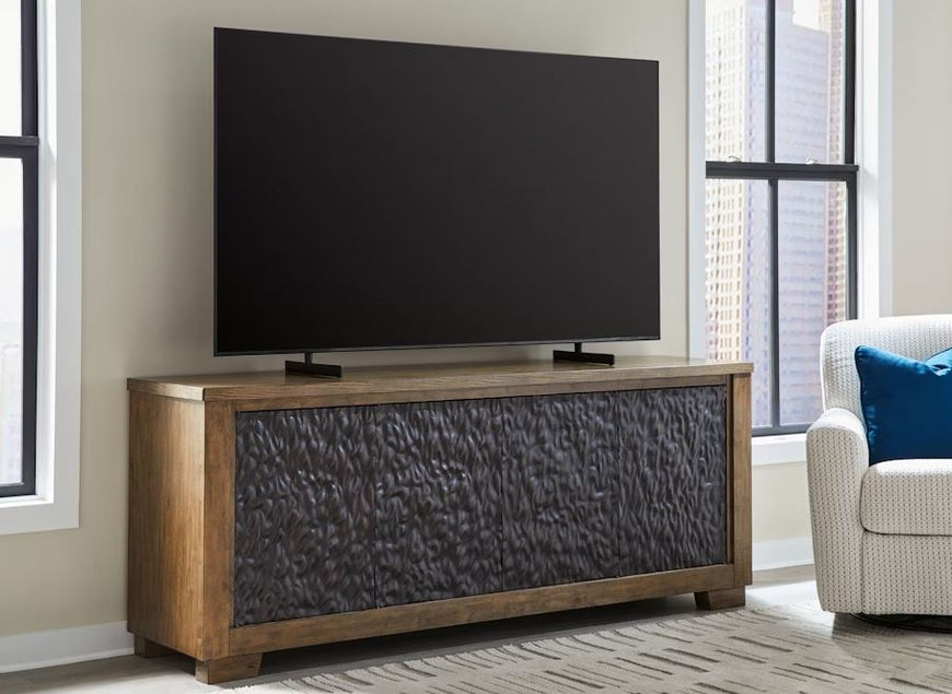This TV stand is not just furniture—it’s a work of art. The cabinet door design is nothing short of a masterpiece. Its deep tribal texture and two-tone finish convey an intentional hand-carved feel creating a unique and attractive surface. Boasting an abundance of storage space and cord management, the large-scale silhouette accommodates flat screen TV’s up to 85 inches.