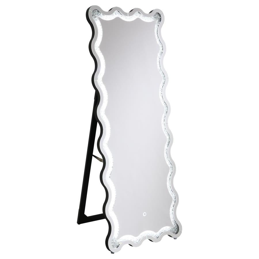 Introduce modern glam sophistication to your bedroom or living area with a contemporary LED floor mirror. It includes a frame that allows it to stand on its own, creating the option for placement anywhere in your space. The mirror boasts a dynamic frame design, with a wavy silhouette created with convex and concave curves that introduce a flowing, engaging ambiance. Mirror and diamond-like trim layers create sparkle and sophistication, perfect for a modern glam bedroom setting. The mirror includes an LED light, perfect for illuminating your daily wardrobe choices in a master suite.