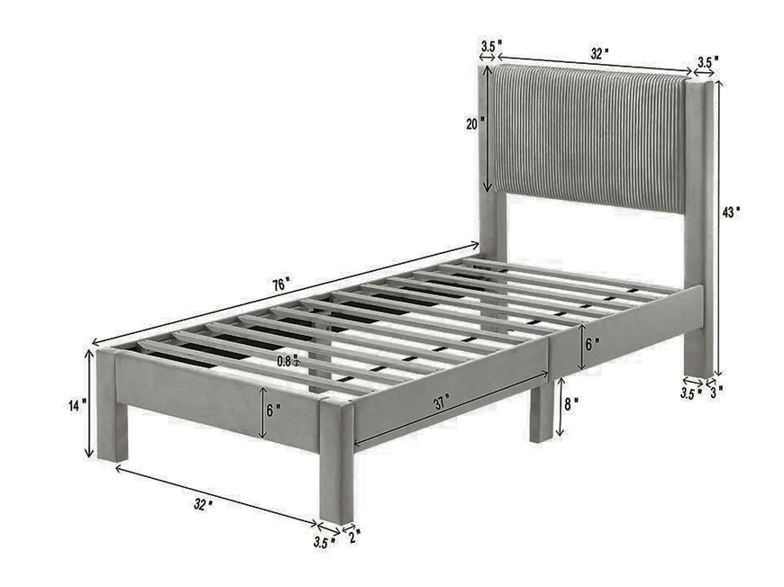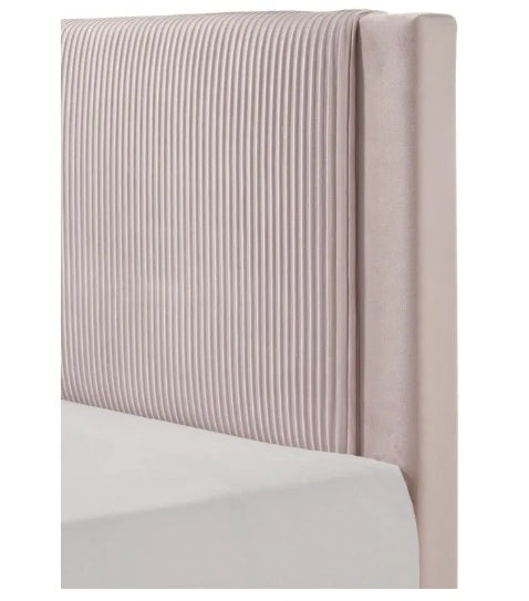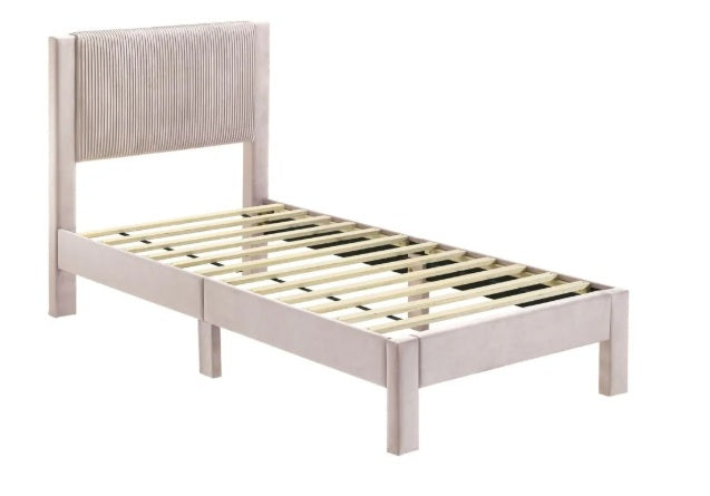 Experience the perfect blend of minimalist design and modern comfort with this elegantly understated bed. Its clean, sharp lines and a sophisticated pink finish create a serene and stylish foundation for any contemporary bedroom. The bed features a streamlined silhouette with a plush, upholstered headboard that boasts a tastefully ribbed texture, providing both visual interest and a comfortable surface to lean against while reading or relaxing. The low-profile frame, supported by sturdy, unobtrusive legs, underscores its sleek, modern appeal, making it an ideal choice for those who prefer a clutter-free aesthetic.