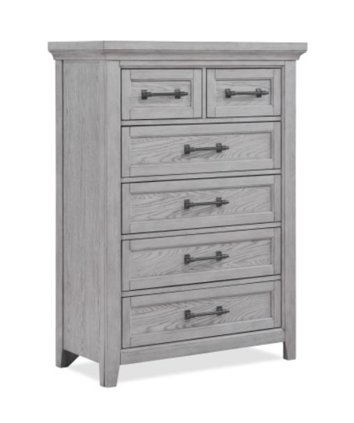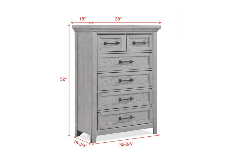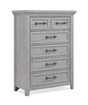 This elegant chest is the epitome of functional sophistication with its weathered gray finish and vertically stacked storage design. Five spacious drawers offer ample space for clothing and accessories, each featuring the collection's signature horizontal paneling and discreet metal handles. The drawers are mounted on smooth metal glides for effortless operation. Its tall, slender silhouette makes it an ideal choice for adding storage in tighter spaces while enhancing the room's aesthetic with its timeless charm.