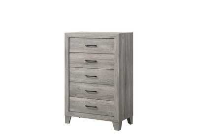 This bedroom set exudes a refreshing, contemporary charm with its light wood grain finish, embodying a serene and airy aesthetic. The bed is a minimalist's dream, with a simple yet stylish headboard that brings a sense of calm to the space. Accompanying the bed is a dresser with a clean, rectangular mirror, a tall chest, and a nightstand, all harmoniously blending functionality with sleek design. Each piece features streamlined handles that enhance the modern look while providing easy access to the ample storage space within.