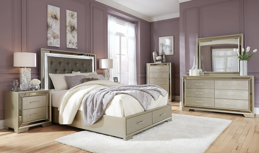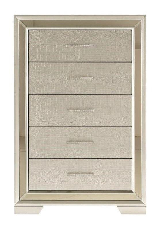Store your things in this sumptuous chiffonier that takes extravagant to a new level. The platinum finish, the beveled tinted mirror inlay frames the crocodile textured drawer fronts, and, to add that finishing touch, the drawer pulls are crystal encrusted.