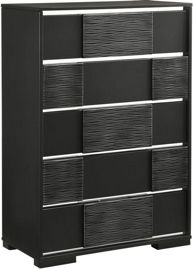 Bold paneling blends with shining lines of chrome to create the striking aesthetic of this five-drawer chest. With plenty of space for an extensive wardrobe, it keeps any bedroom organized in style. Each drawer is enhanced by a chambered drawer front for a look that exudes modern grace.