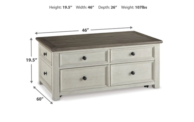 Store, serve and showcase your favorite things with the Bolanburg lift top cocktail table. Its textured antique white finish creates a vintage two-tone look that will endure for years. 4 smooth-gliding drawers Made of veneers, wood and engineered wood Casters for easy mobility Spring-lift top Two-tone antiqued finish Minor assembly...