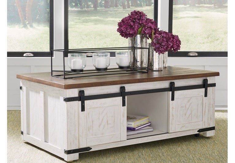 This coffee table is expertly crafted with a distressed vintage white finish and contrasting aged natural pine tabletop. This generously sized coffee table combines a look you'll love with the storage you need. Sliding barn doors on both sides hide easy-access storage cubbies perfect for magazines, throws, board games and more. An open shelf in the middle provides more storage or room for decorative items. This attractive table blends rustic and natural style while lending a unique feel to your home.