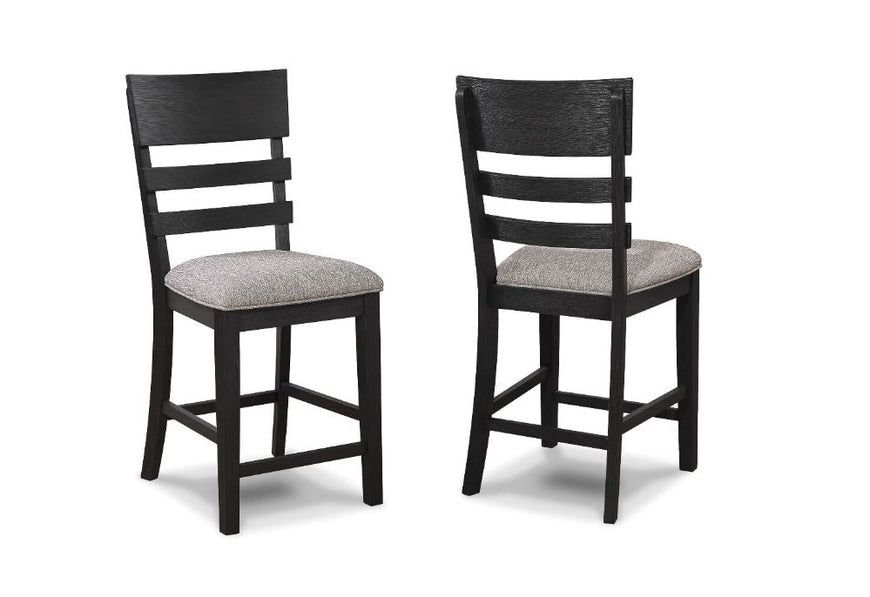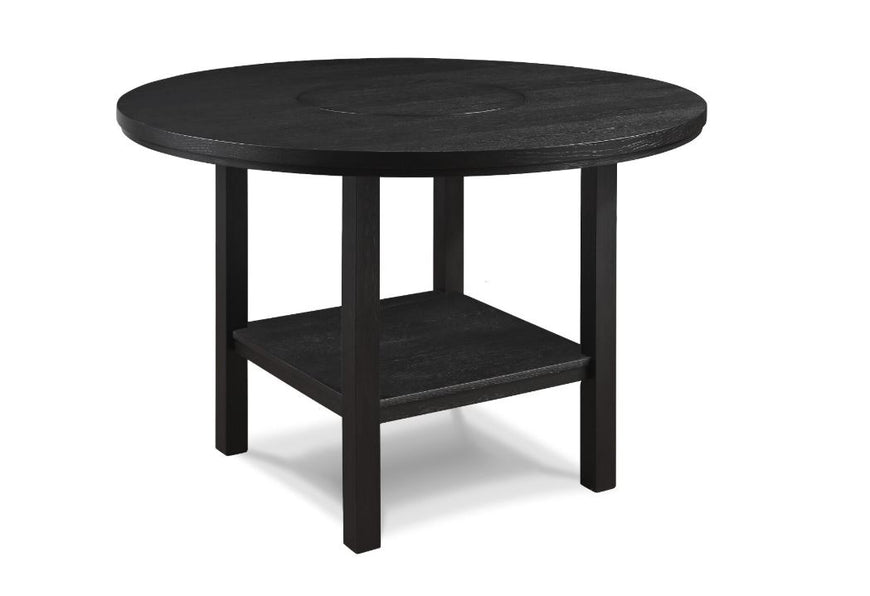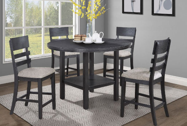 Elevate your dining experience with this contemporary dining group, where modern design meets rustic charm. Crafted with a rich, dark finish, the 54" round-top table offers ample room for both intimate dinners and festive gatherings. The subtle grain detailing on the table's surface adds depth and character, while the shelf base ensures stability and longevity. Complementing the table are the sleek, slat-back chairs, designed for comfort and style with their plush upholstered seats.