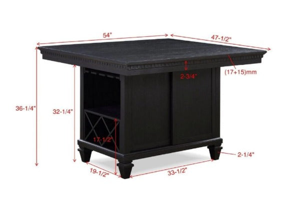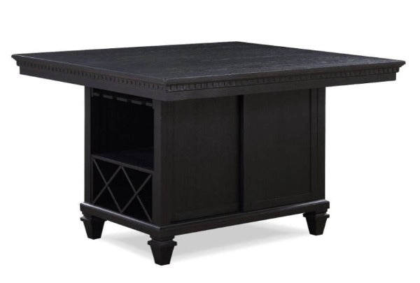 This Marlene Counter Height table with 4 chairs features a pedestal base with built-in wine bottle and glass storage. Details such as intricate dentil molding and upholstered seats add charm to this dining collection. This item is a Floor Sample Special Table:48" x 54" x 36" H. Side chair: 20.5" x 20" x 45"...