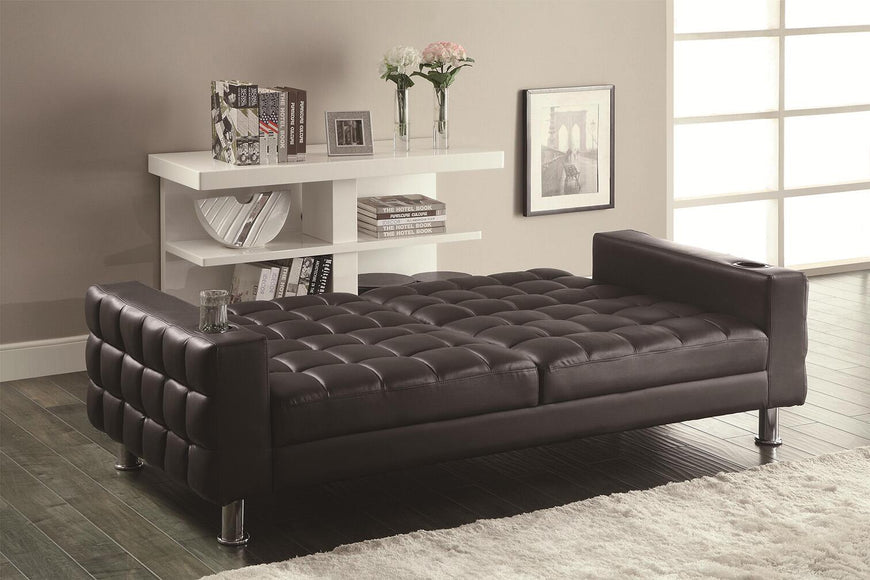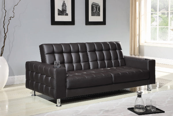 This brown faux leather sofa bed can serve as the focal piece of your living room with its elegant tufting on the seat and back. The sofa bed's hearty, kiln-dried construction is made for heavy use and stability. The sofa features beautiful chrome legs that contrast nicely against its brown coloring, arm rests with cup holders to keep drinks within arms reach, and an independently functioning split back. Throw in a bit of sinuous spring decking and high-density foam and you have a supremely comfortable sofa, perfect for you and guests.