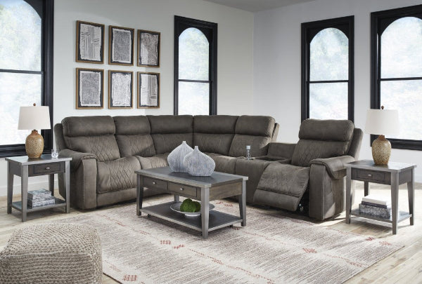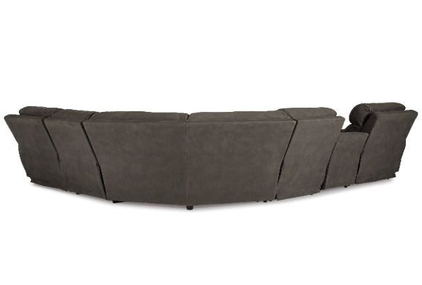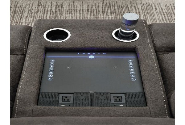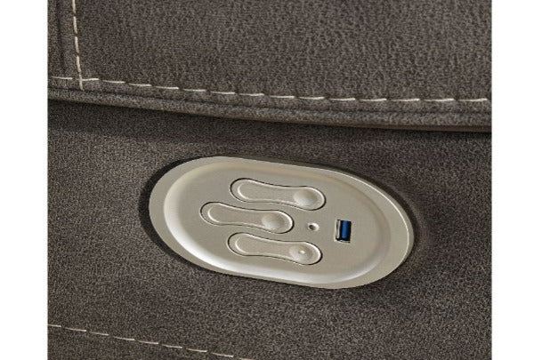 Stylish in design and function, this power reclining sectional with console creates a comfortable place to gather with family and friends. The sectional, upholstered in heavyweight faux leather with quilting and jumbo stitching, invites you to sink into plush opulence at an affordable price. The zero-wall power reclining mechanism features infinite positions for comfort. Conveniently plug in your devices to the USB charging station. Appealing to those with an eye for sumptuous design and high-tech features, this gunmetal gray sectional will always be a win.