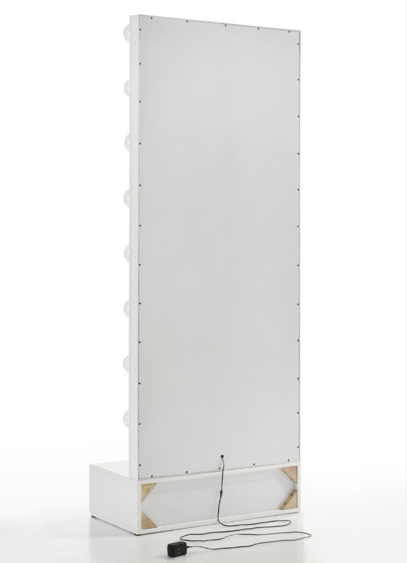 Step into a world of glamour with this sleek and chic vanity set, a perfect fusion of functionality and fashion. Its glossy white finish and clean lines are complemented by the sparkle of a crystal-like knob, adding a touch of sophistication to your personal space. The full length mirror is surrounded by radiant lights, while the ample drawer provides storage for essentials. A perfect spot to check your outfit of the day.
