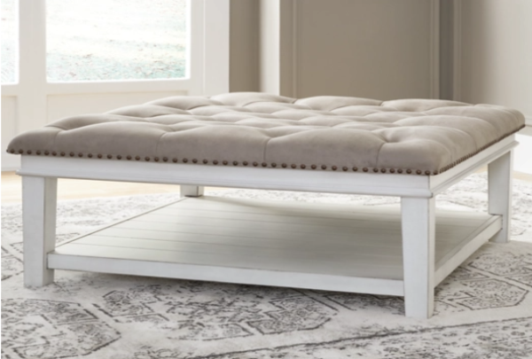 Ideal as a footrest or coffee table stand-in, this ottoman coffee table adds an all-purpose farmhouse touch to your living space. Crafted with comfort and convenience in mind, this square ottoman features a faux leather button tufted seat with nailhead accents. Enhancing its casual appeal, a handy lower shelf houses throws, reading material and other essentials.