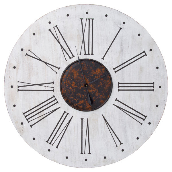 The Scandinavian Style Wall Clock features clean forms and naturally rich textures. Majority of the face of the clock is whitewashed wood, accented with rustic metal center, black roman numerals and slick black hands. This is a rather large clock. being 47.5 inches in diameter it will perfectly accentuates a larger wall.