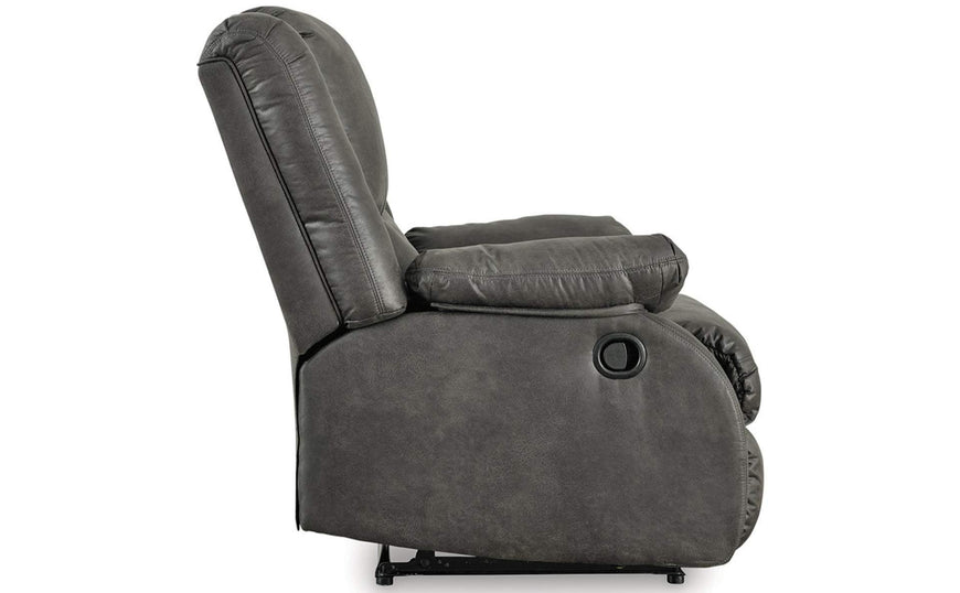 Make a big impression in a smaller footprint with this chicly styled zero wall recliner. Thanks to its space-conscious design that requires a mere three inches between the wall and chair back, you can stretch out more efficiently. Wrapped in a fabulous faux leather loaded with pebbly texture and tonal variation that looks so natural, this designer recliner sports contoured tufting and contrasting baseball stitching for a style home run.